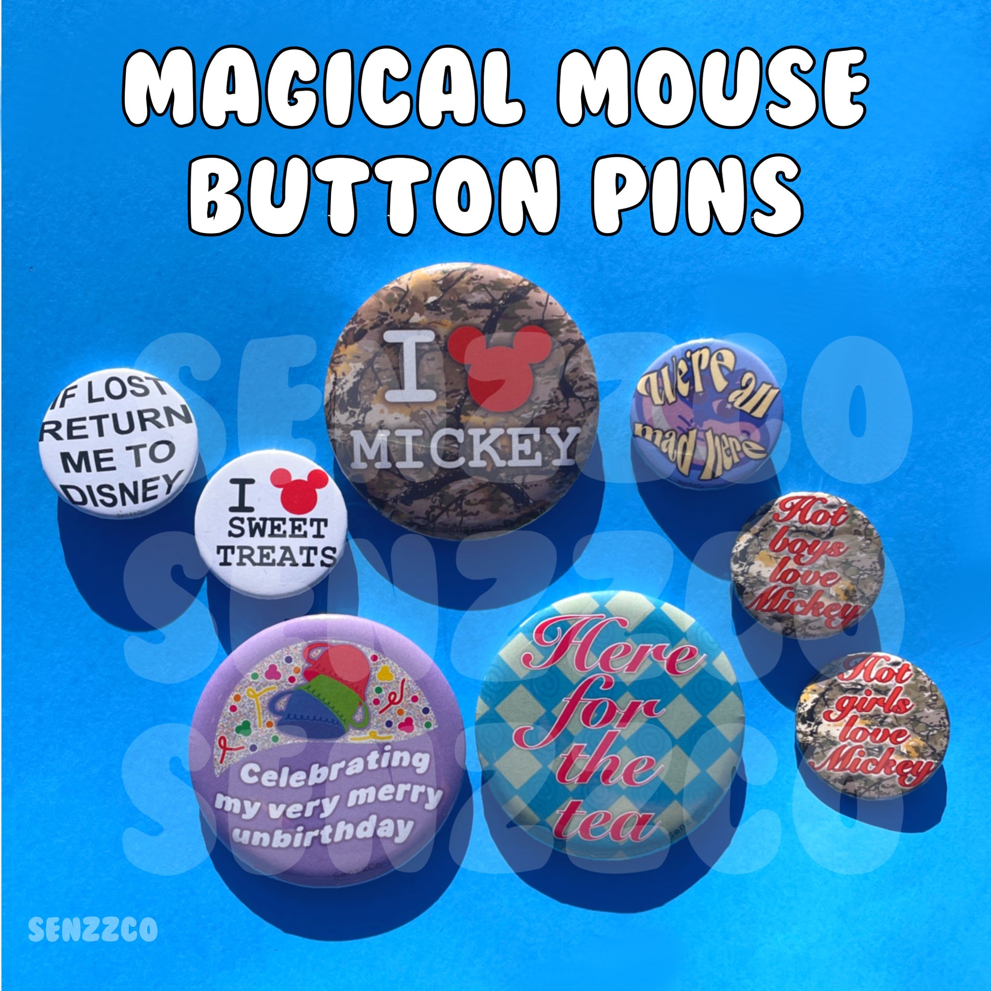 These magical mouse inspired button pins are perfect for jackets, totes, purses, bags, lanyards, almost everywhere!! Whether you’re on your way to the parks, or not- these pins are sure to make any magical obsessed person smile!