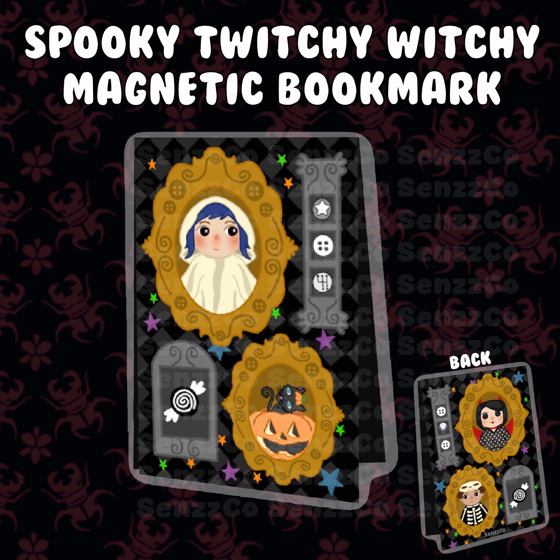 Front side features our favorite ghost girl (twitchy witchy girl) and WussPuss cat, and the backside featuring the other mother and skeleton boy. You can flip to whichever sides you want to be shown on the front side!